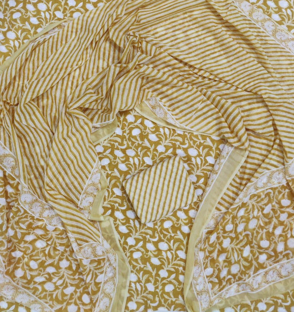Bring home the charm of tradition with this exclusive hand block printed cotton dress material. Crafted with care, this set includes a cotton top, cotton bottom, and cotton dupatta, ensuring both comfort and elegance.