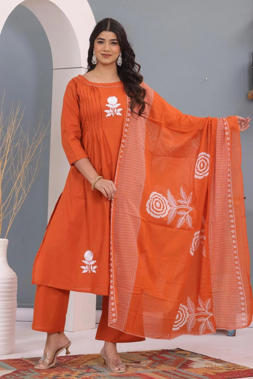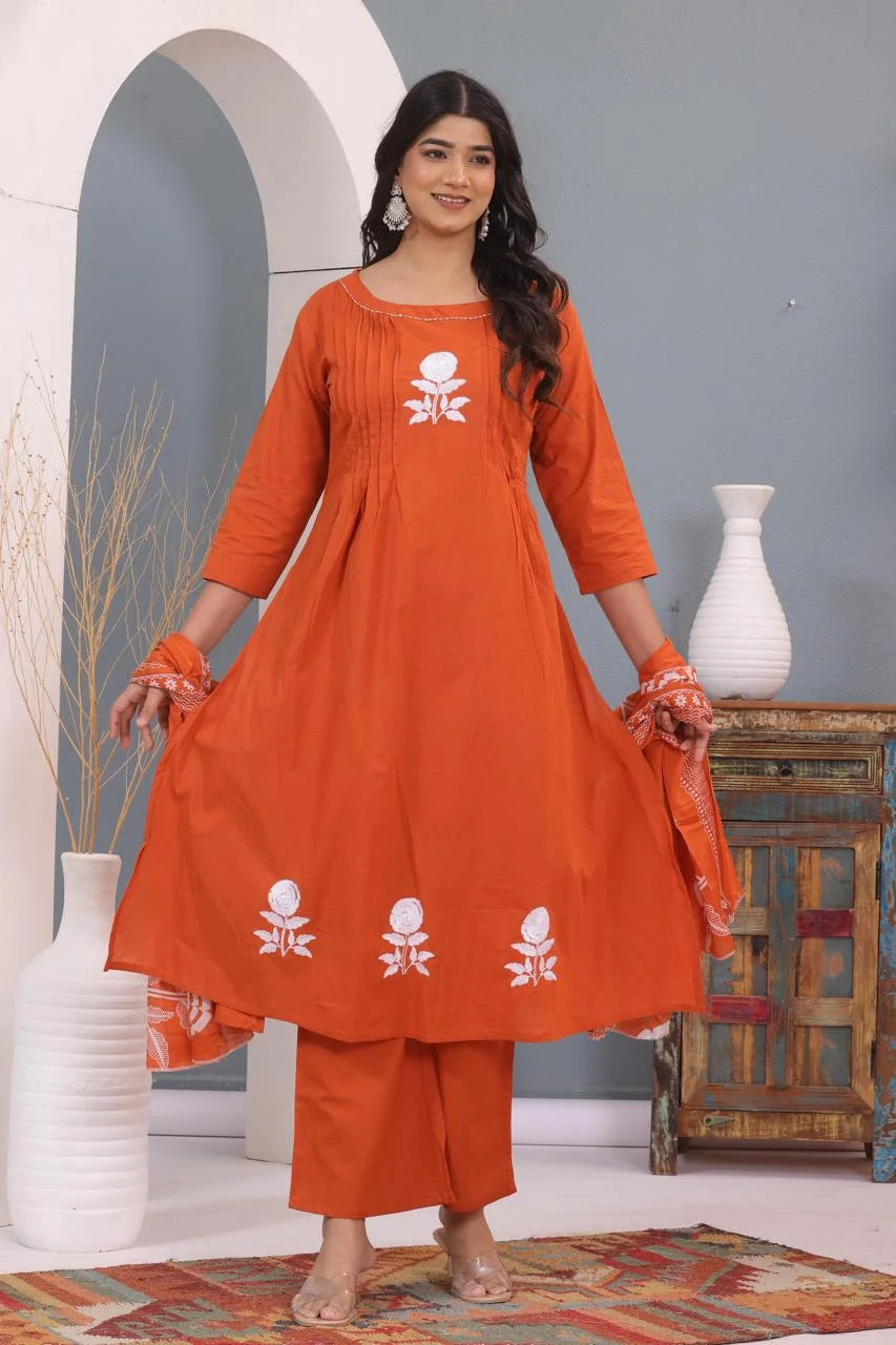 Experience elegance in motion with this beautifully crafted A-line 3-piece kurta set, made from pure cotton (60×60). The kurta features discharge dye printing and detailed embroidery, adding depth and charm to your ethnic look. Paired with flowy palazzo pants and a matching dupatta, this set is perfect for festive occasions, casual outings, or workwear.