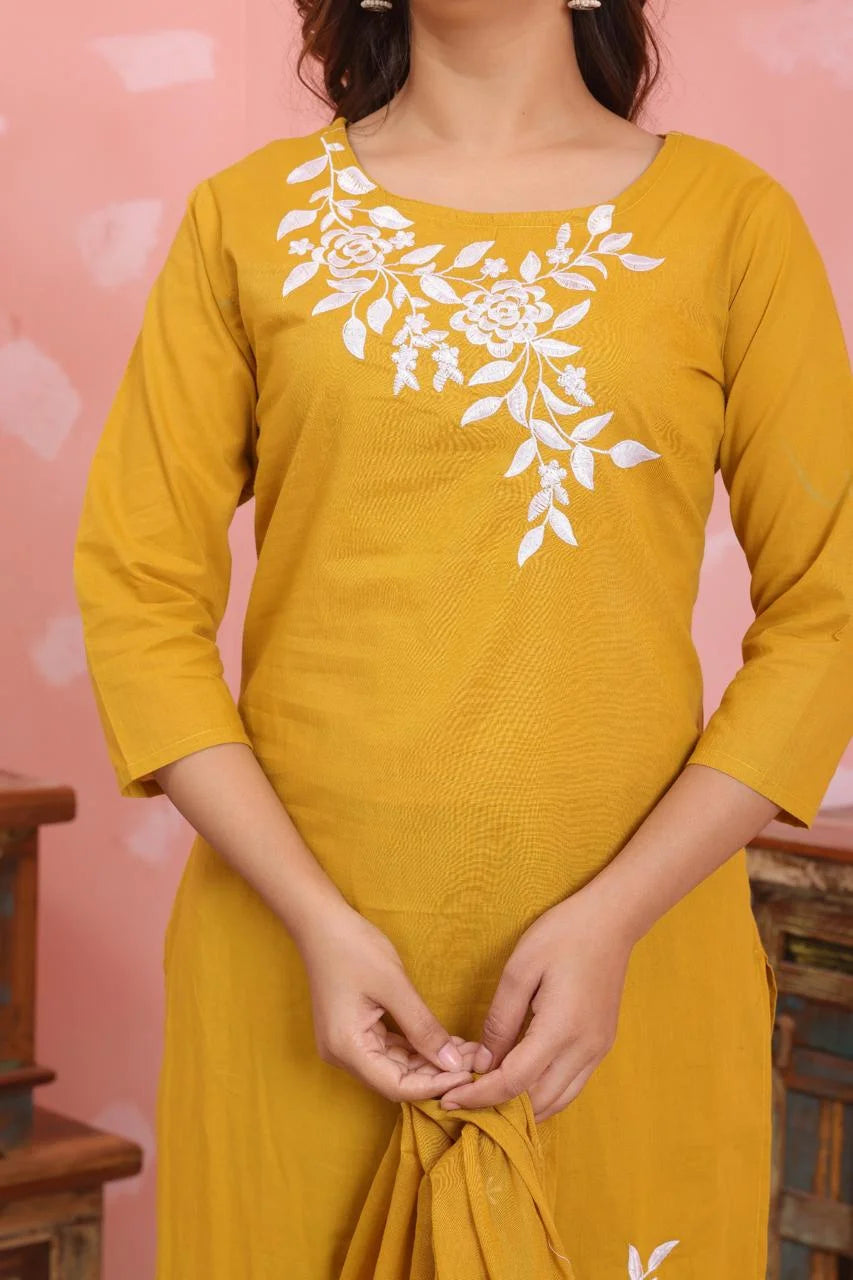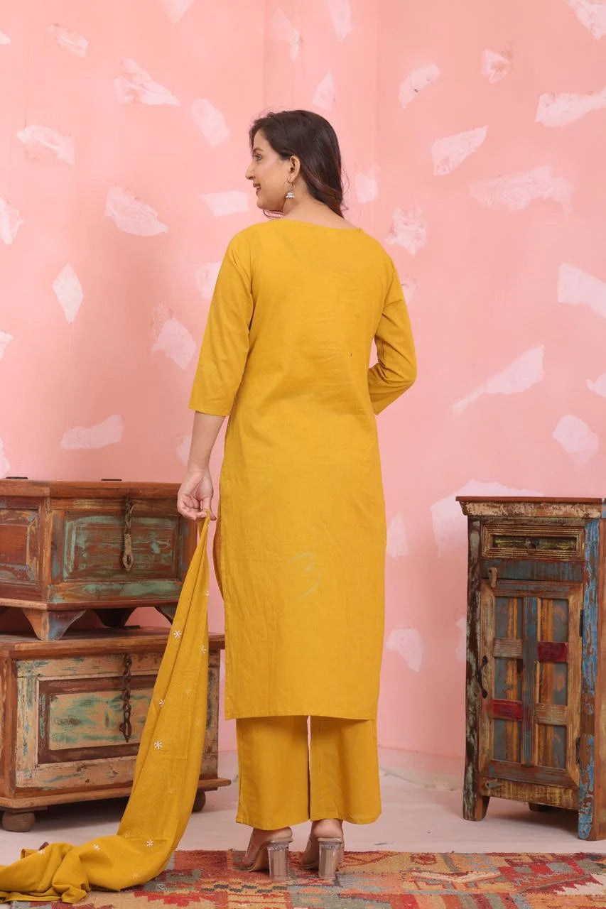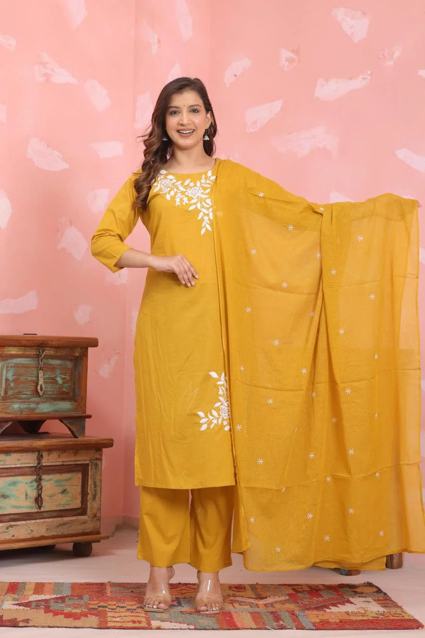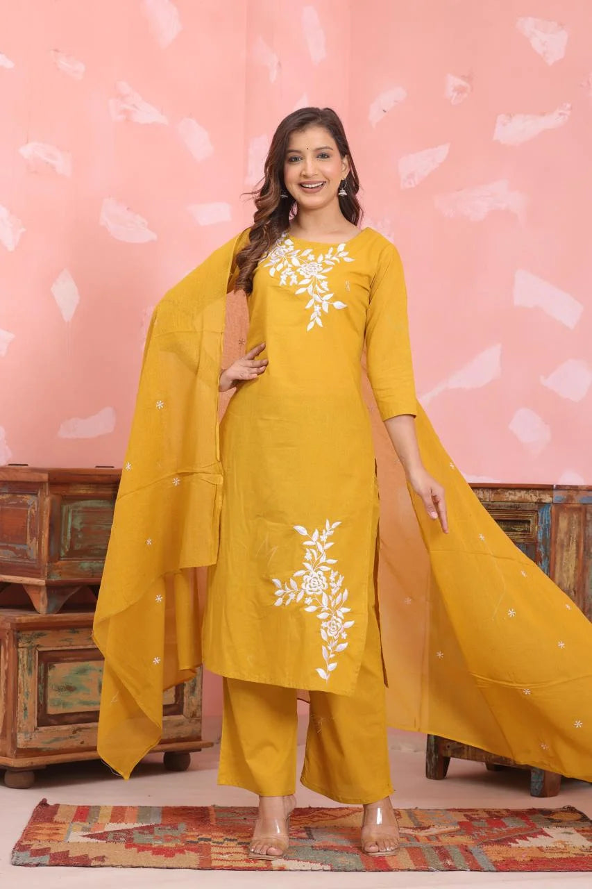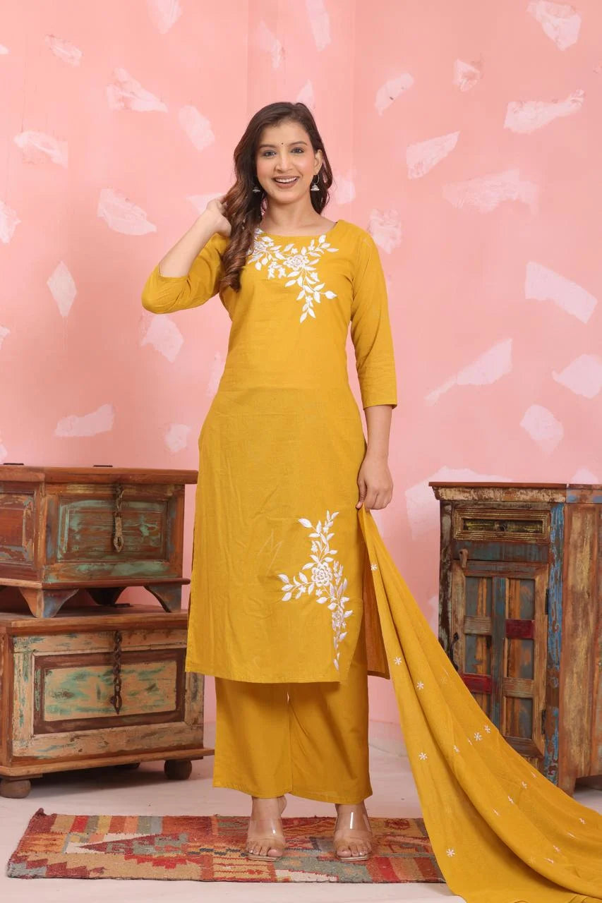 Kurta: Made from high-quality pure cotton (60×60), featuring stunning discharge dye prints and intricate embroidered patterns that add a classy ethnic charm.