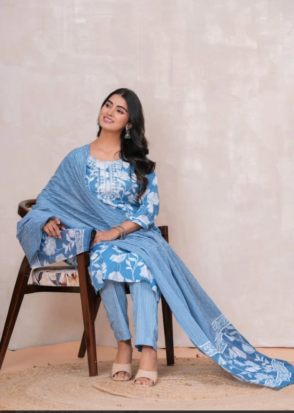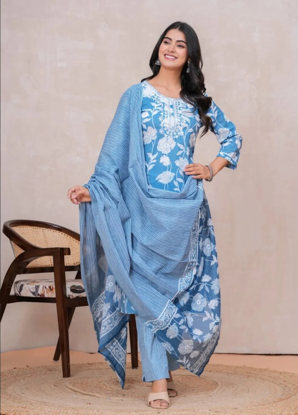 Elevate your ethnic wardrobe with this beautifully crafted pure cotton kurta, featuring a vibrant discharge print and delicate embroidery work. The breathable cotton fabric ensures all-day comfort, while the elegant design adds a touch of class—perfect for daily wear or festive occasions.